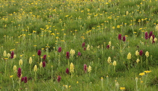 Look a little closer however and you will find other orchids… High in the alpine pastures of the Gran Sasso National Park, the rugged limestone plateau rolls majestically through open plains giving the region its alternative name of ‘Little Tibet’. This harsh landscape is locked in ice and snow for five months of the year but, come May, the grasslands erupt into flower. Most conspicuously amongst the melee of colour is the elder-flowered orchid (Dactylorhiza sambucina). This is a true mountain specialist, found no lower than 1,500 m above sea level where snows linger well into the summer. The squat chunky spikes are unusual in that they come in two contrasting colours – custard yellow and deep magenta. This isn’t by chance. The dual colour technique dupes unwitting bumblebees into visiting one colour before giving up and trying the other and so maximising pollination.