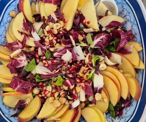 Combine radicchio, watercress, apples and pomegranate arils. Top with roasted or raw hazelnuts. Make a dressing by combining olive oil, balsamic vinegar, a teaspoon of dijon mustard and honey.